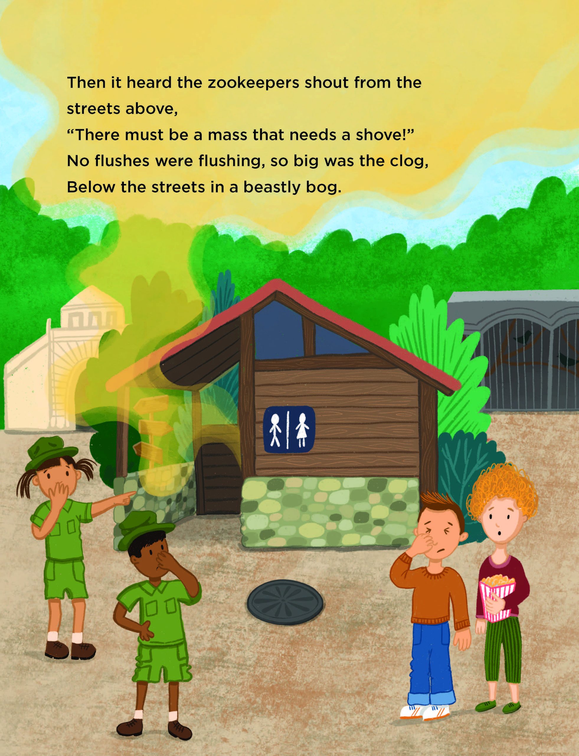 Then it heard the zookeepers shout from the streets above, "There must be a mass that nedds a shove!" No flushes were flushing, so big was the clog, Below the streets in a beastly bog.